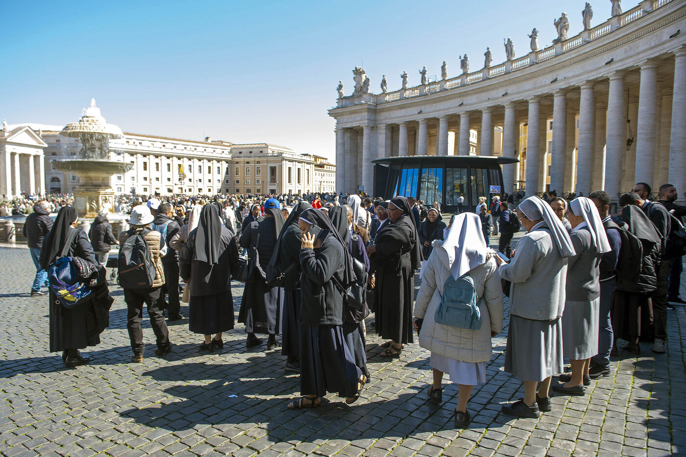 Faithful walk around St. Peter's Square while the Pope is unavailable due to illness and will not lead the Angelus prayer at the Vatican on 2025/3/30. Photograph by ALESSIA GIULIANI / CPP / HANS LUCAS.