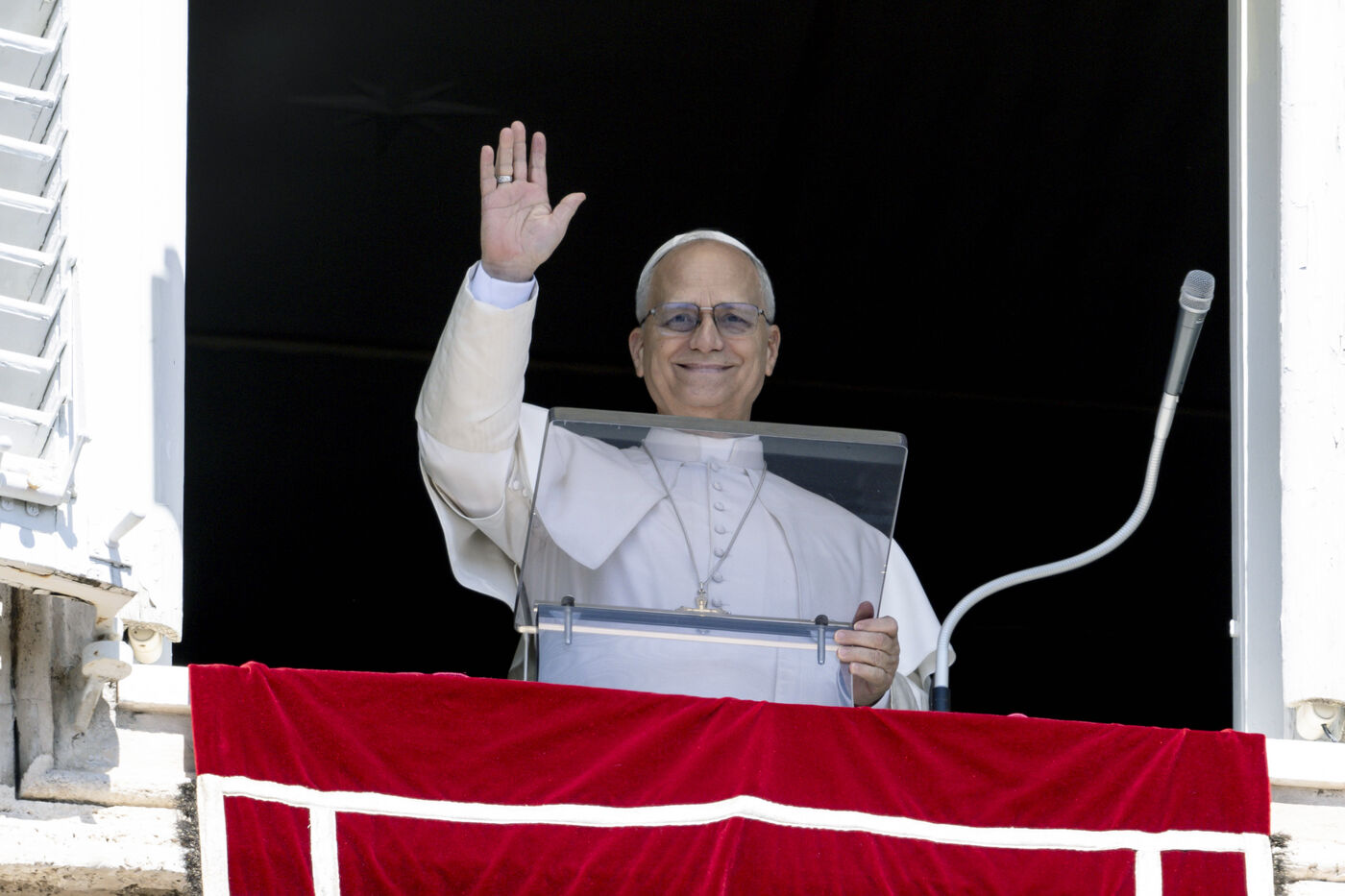 Pope Leo XIV addresses the crowd from the window of the apostolic palace overlooking St. Peter's square during the Regina Caeli prayer in The Vatican on 2025/8/31.