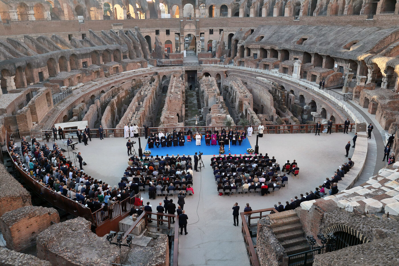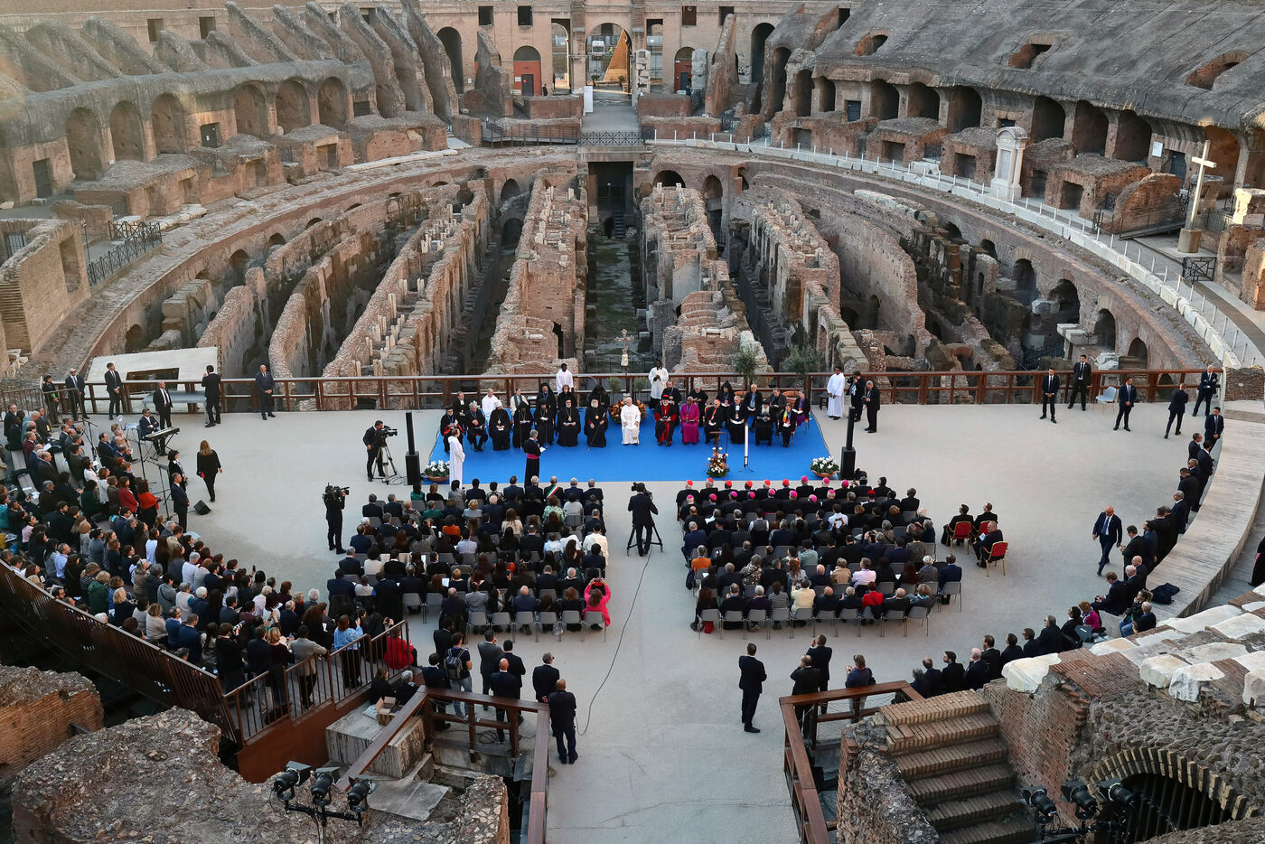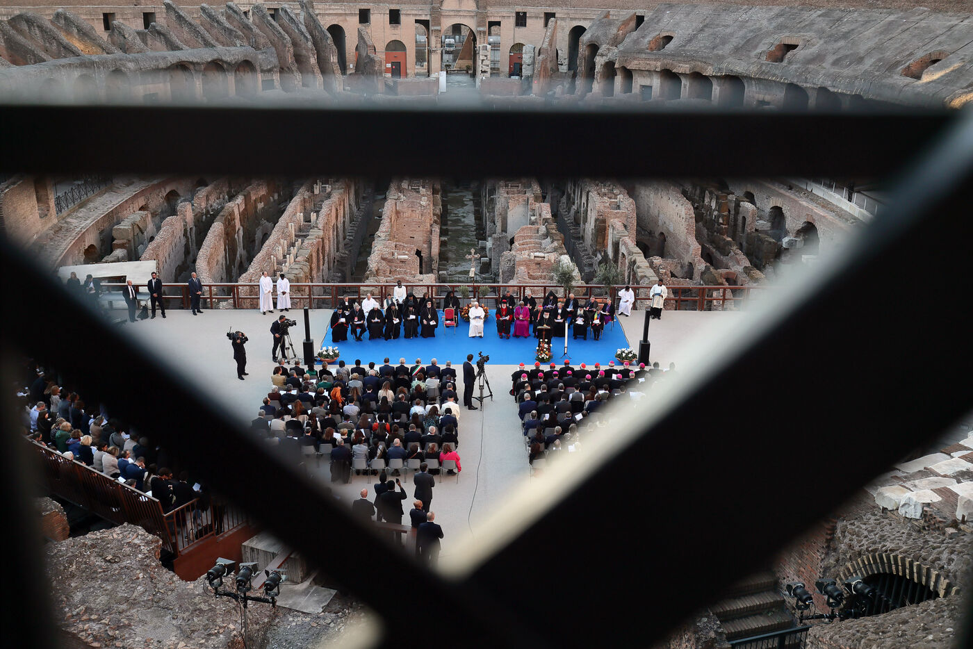 Pope Leo XIV attends an inter-religious meeting organised by the Sant' Egidio Community to pray for peace in front of the Arch of Constantine outside the Colosseum in Rome in Italy on 2025/10/28.