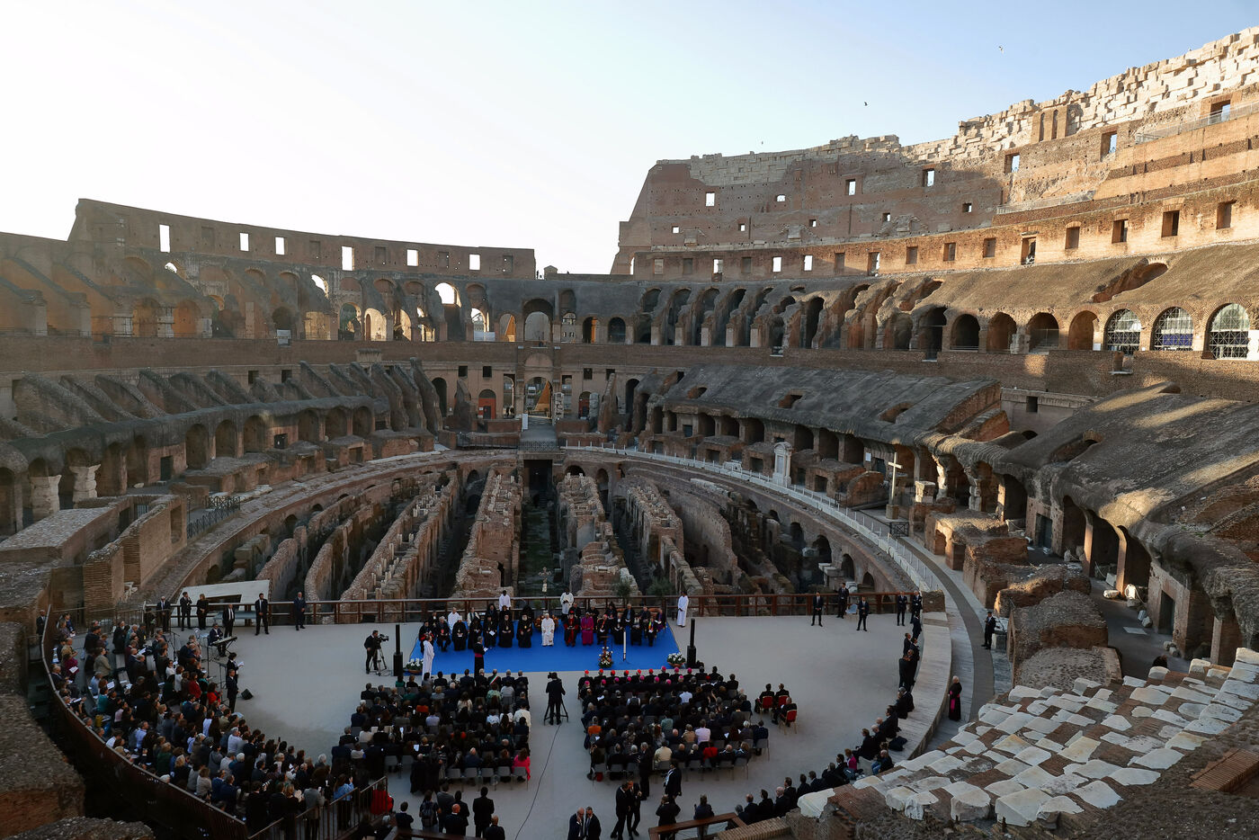 Le pape Léon XIV participe à une rencontre interreligieuse organisée par la Communauté Sant'Egidio pour prier pour la paix devant l'Arc de Constantin, à l'extérieur du Colisée, à Rome, en Italie, le 28 octobre 2025.