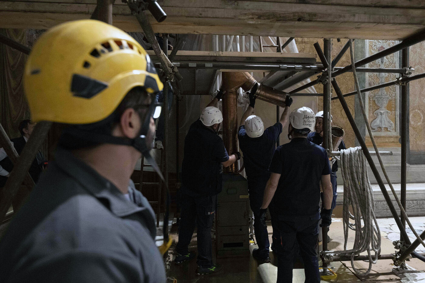 Firefighters fix the chimney on the roof of the Sistine Chapel