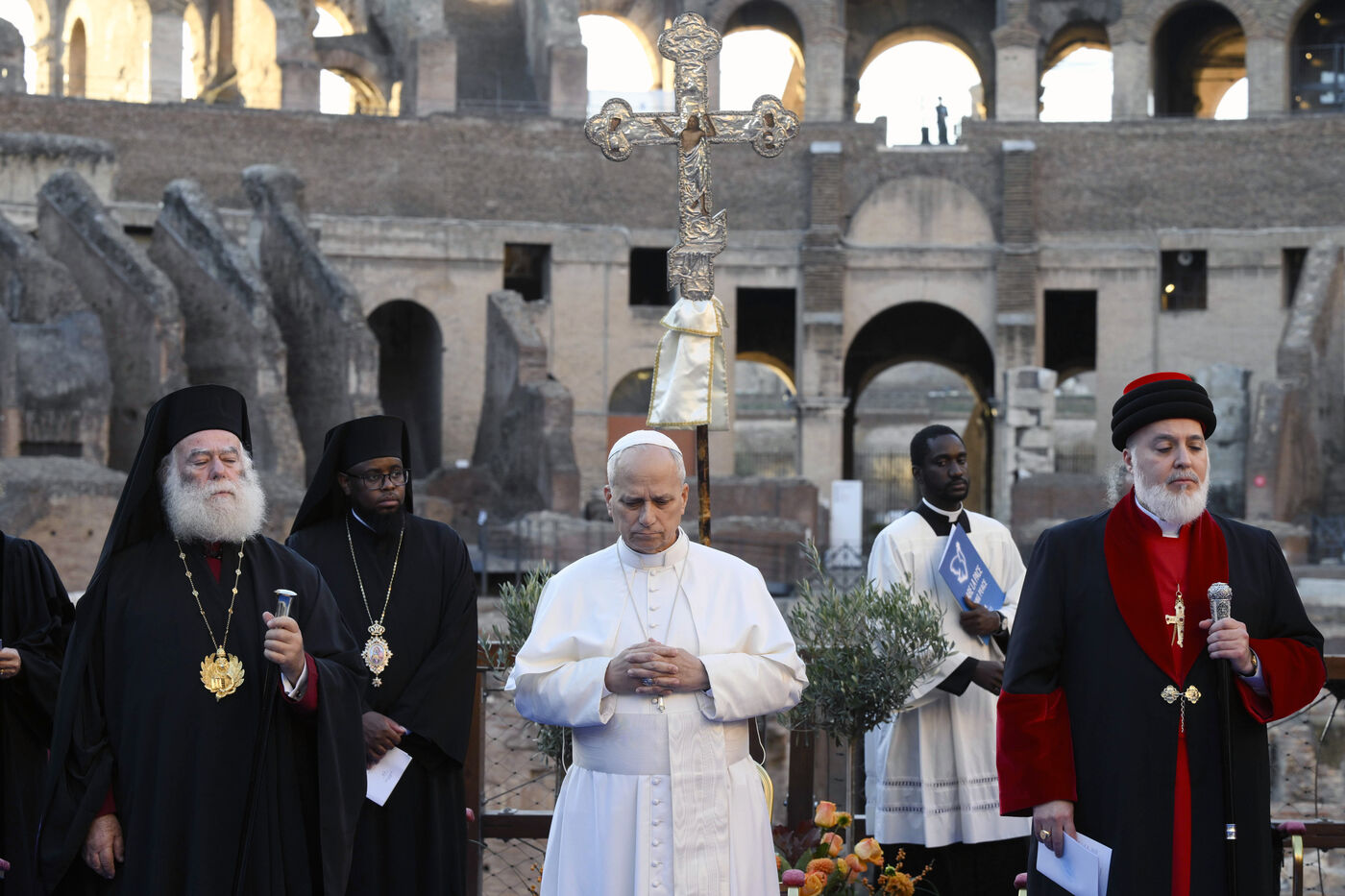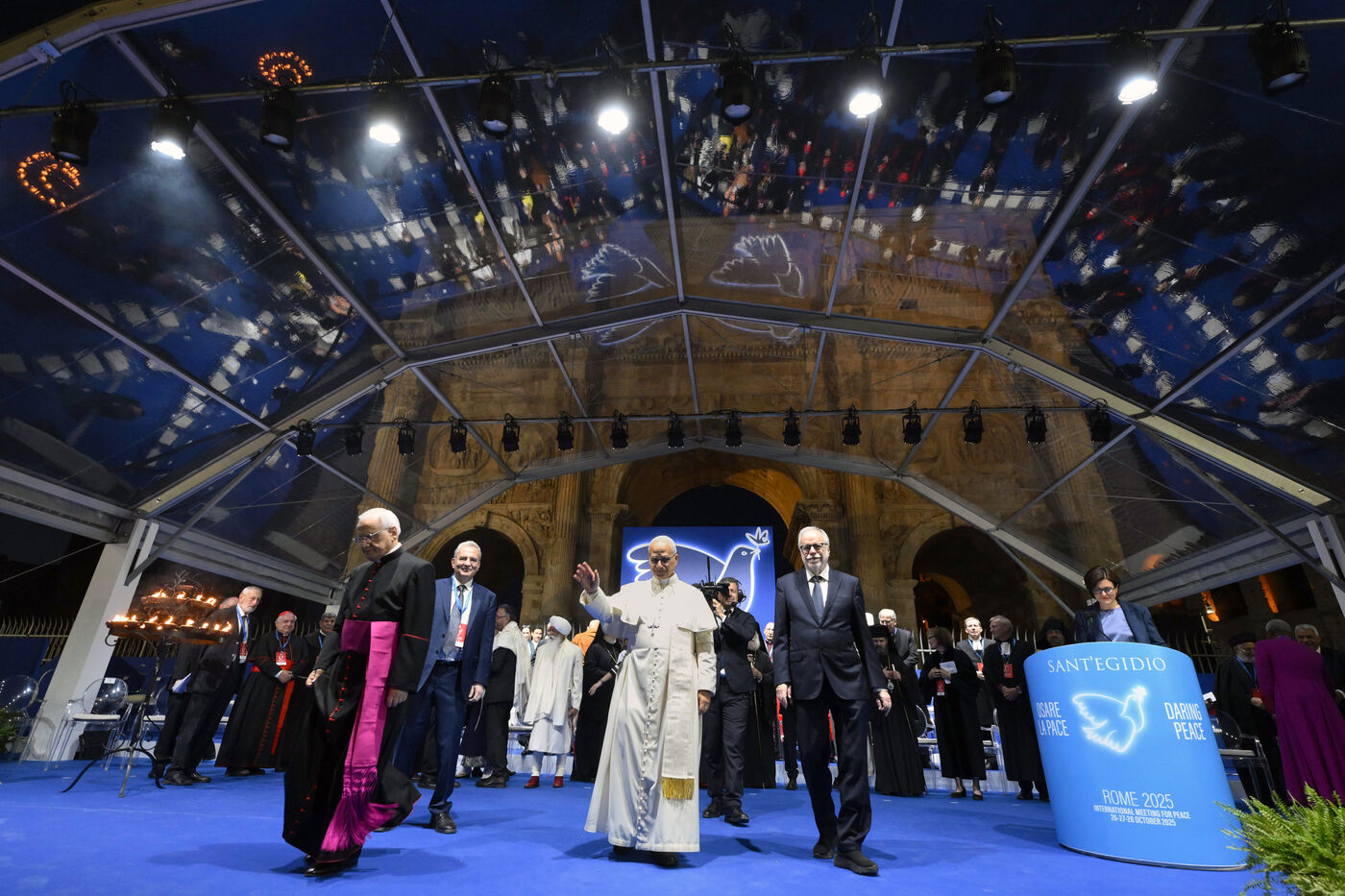 Le pape Léon XIV participe à une rencontre interreligieuse organisée par la Communauté Sant'Egidio pour prier pour la paix devant l'Arc de Constantin, à l'extérieur du Colisée, à Rome, en Italie, le 28 octobre 2025.