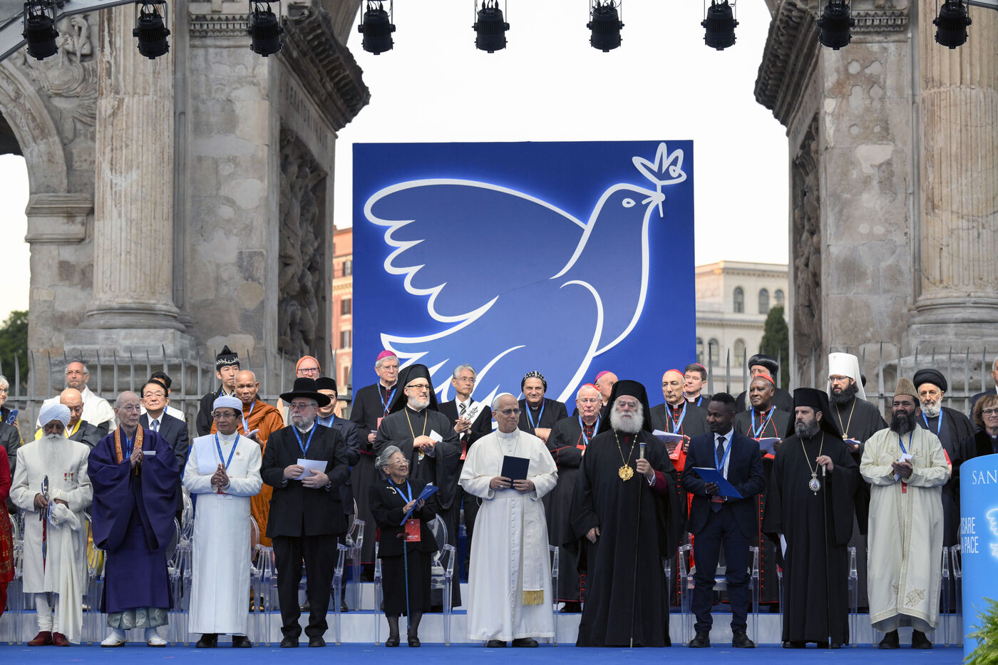 Pope Leo XIV attends an inter-religious meeting organised by the Sant' Egidio Community to pray for peace in front of the Arch of Constantine outside the Colosseum in Rome in Italy on 2025/10/28.