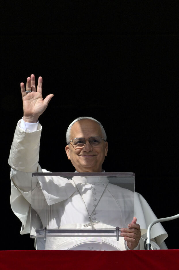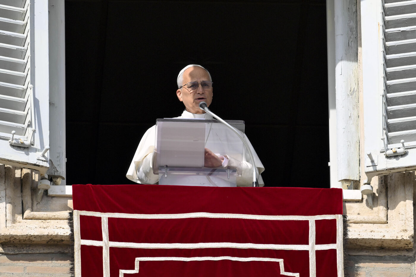Le pape Léon XIV salue la foule depuis la fenêtre du palais apostolique surplombant la place Saint-Pierre pendant la prière de l'Angélus au Vatican, le 2 novembre 2025.