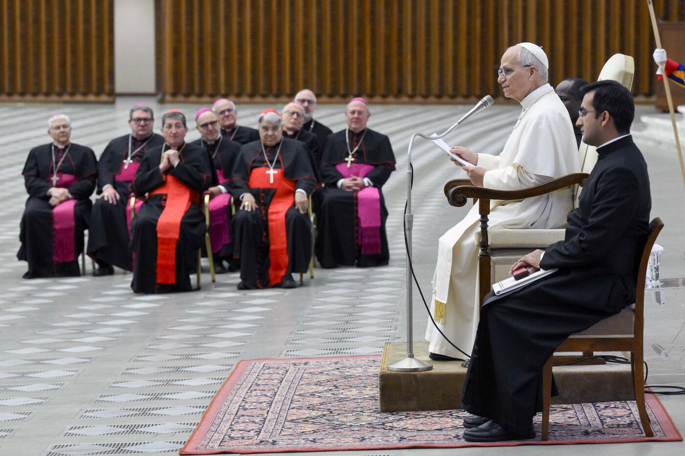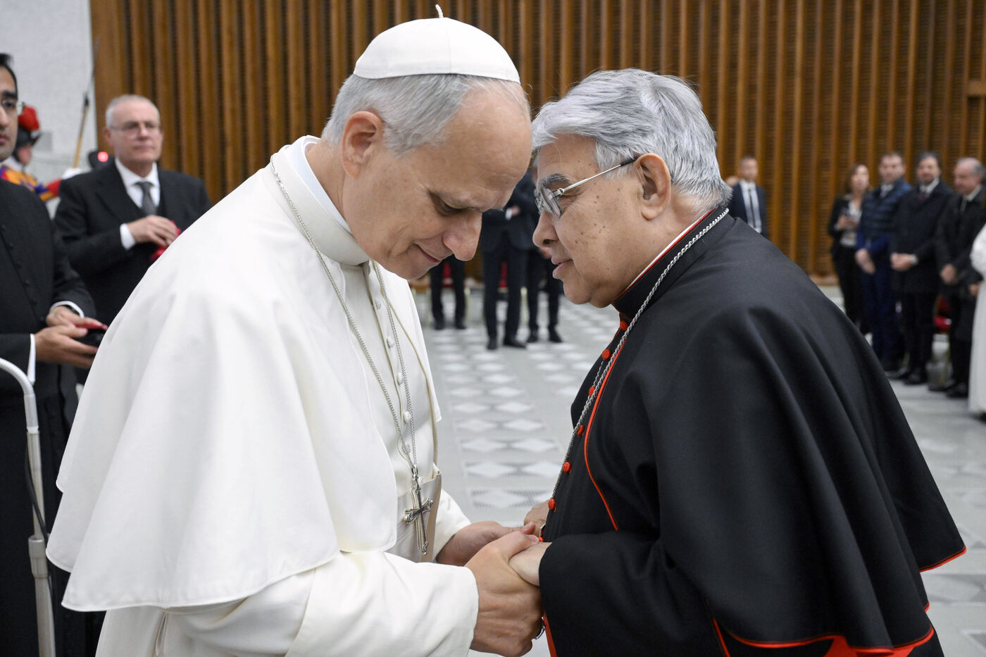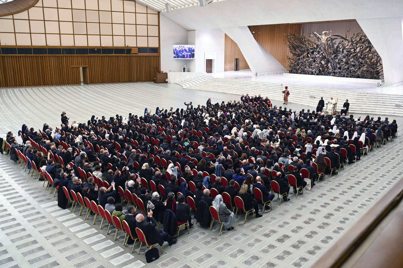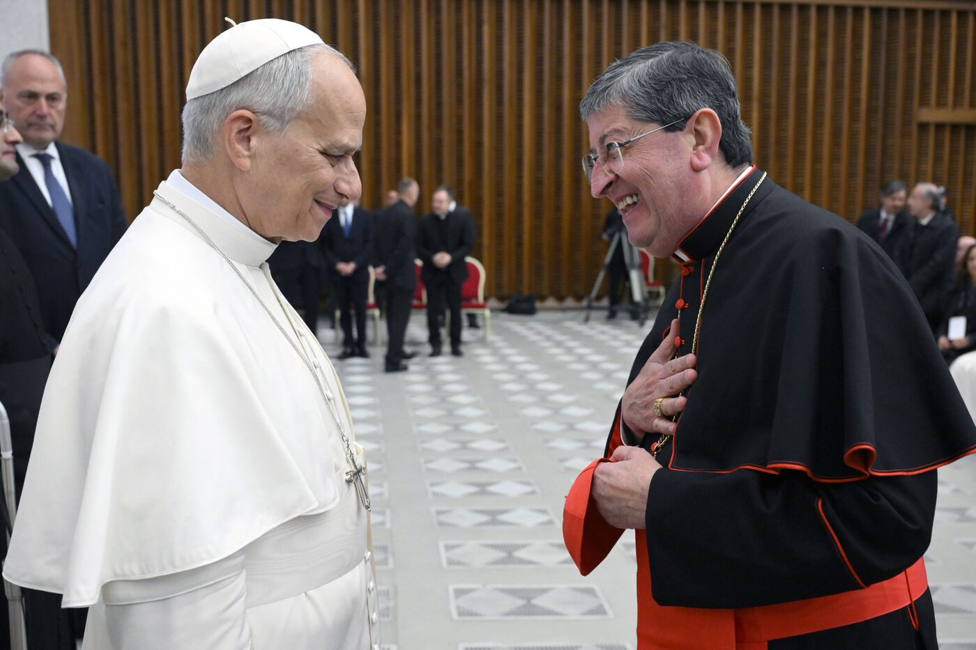 Le pape Léon XIV rencontre les participants à la conférence organisée par la Congrégation pour les causes des saints dans la salle Paul VI au Vatican, le 13 novembre 2025.