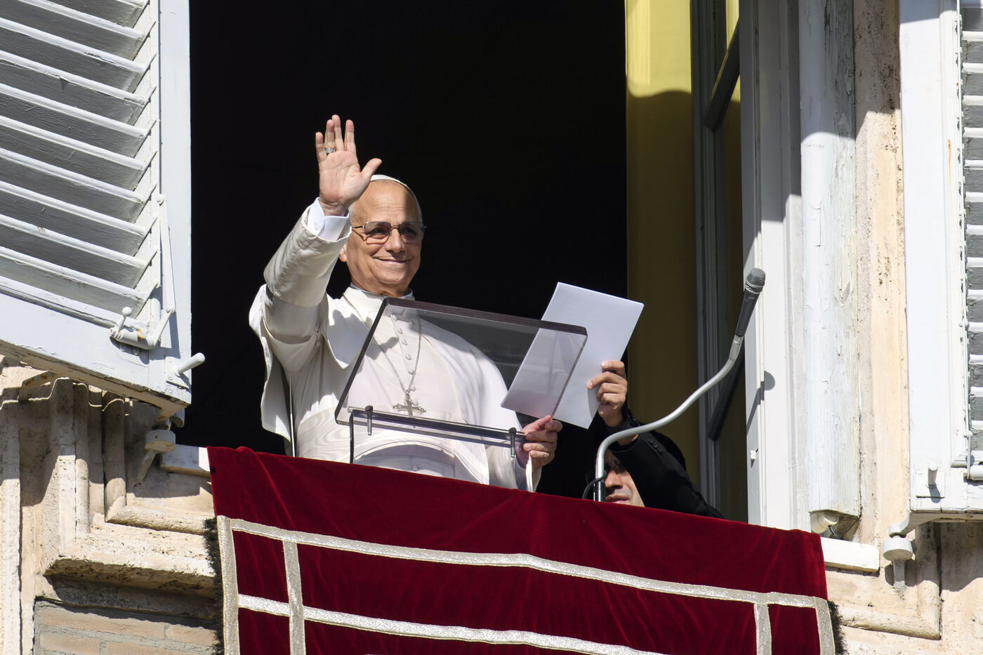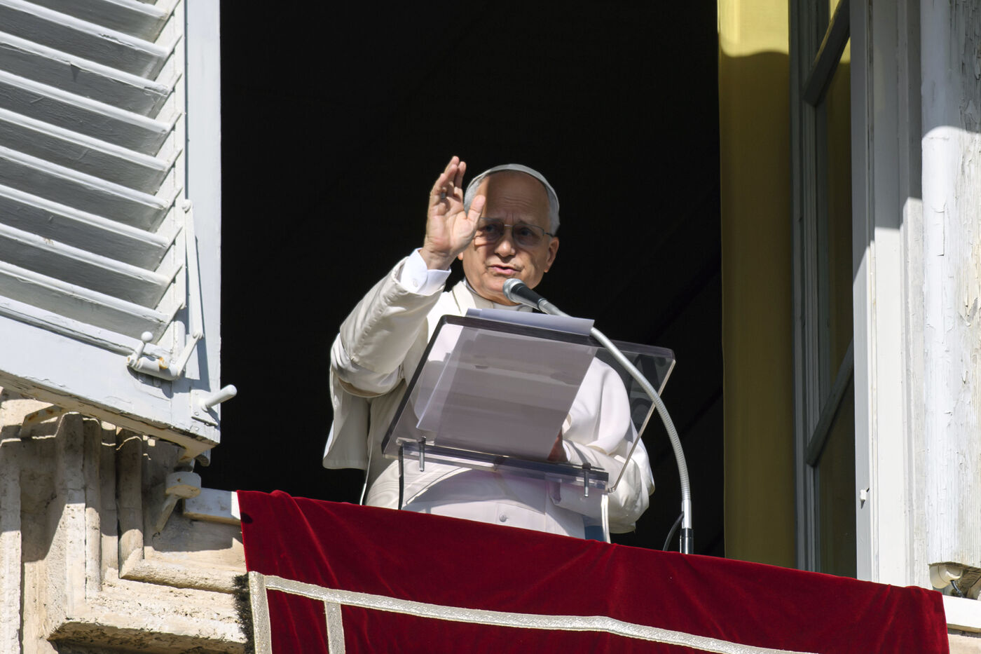 Pope Leo XIV delivers his blessing to the faithful during the Angelus prayer