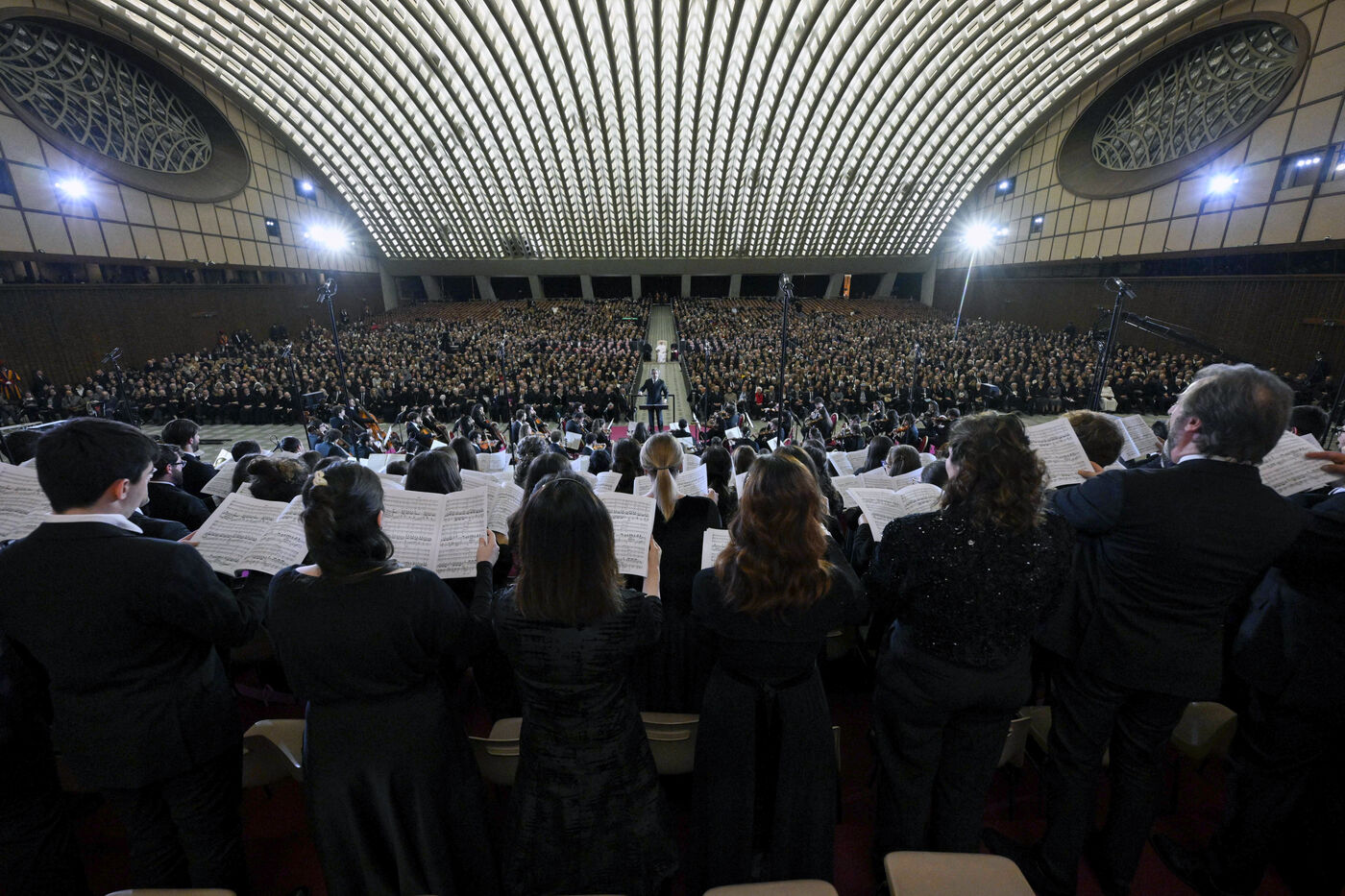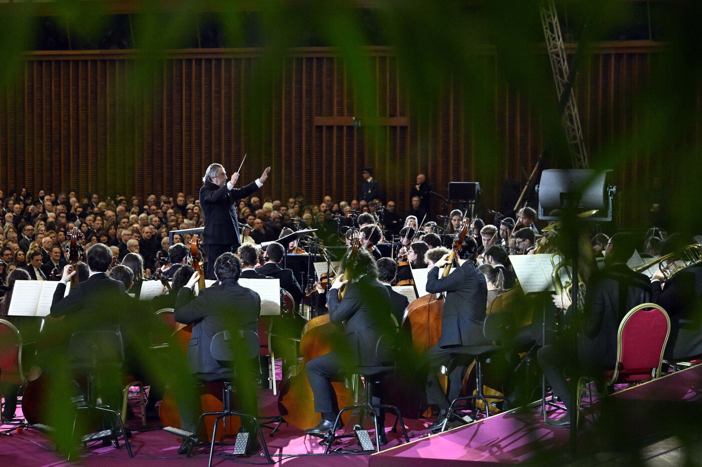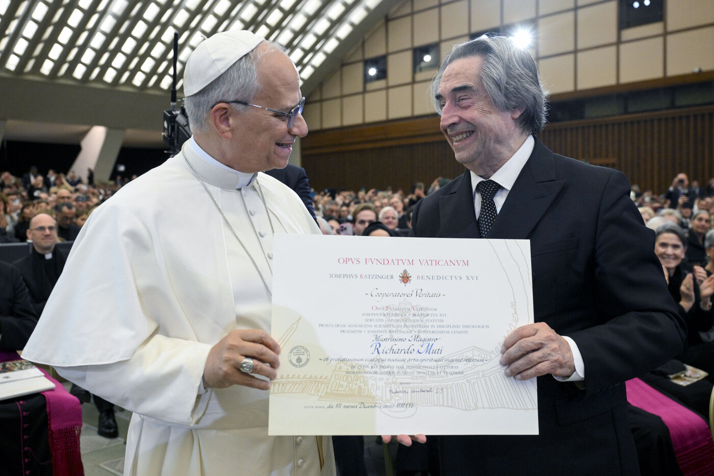 Pope Leo XIV attends a Christmas concert conducted by Italian conductor Riccardo Muti who will be awarded with the Ratzinger prize, in the Paul VI Hall, at the Vatican on 2025/12/12.