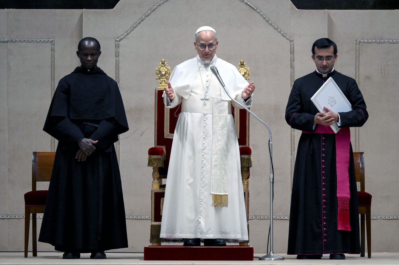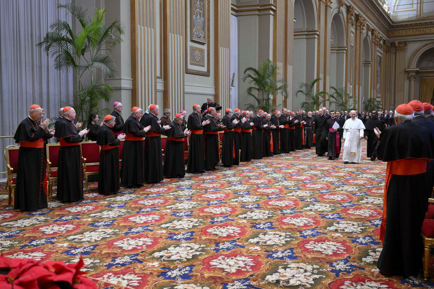Pope Leo XIV receives the Roman Curia for the exchange of Christmas greetings 2025 in the Vatican on 22 December 2025.
