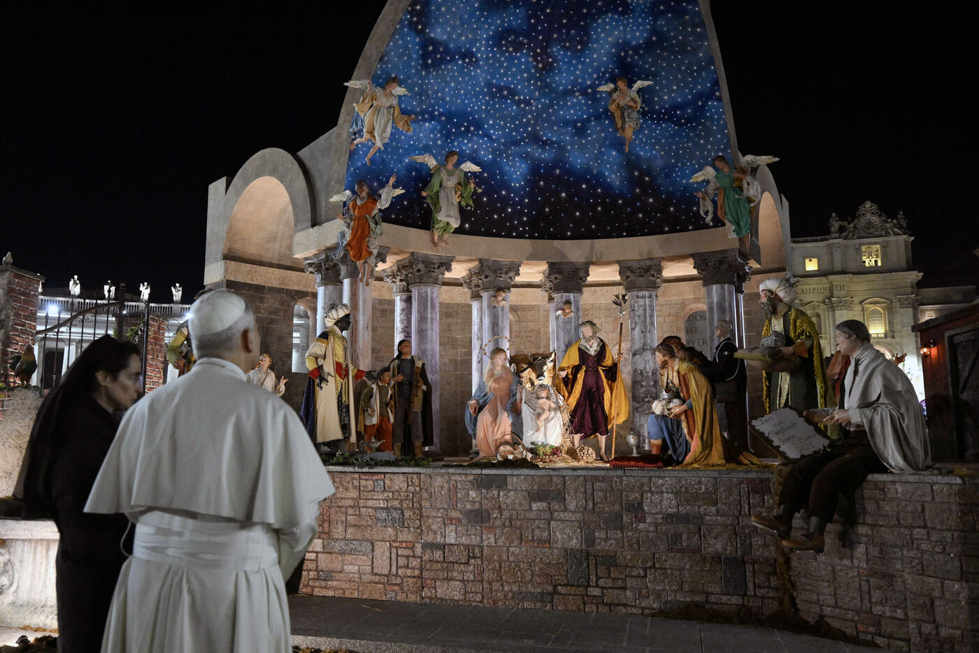 Pope Leo XIV after a moment of prayer in front of the nativity scene that adorns St.Peter's Square at the Vatican on 2025/12/31.